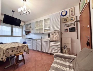 L'appartamento dispone di un'accogliente zona giorno con cucina a vista, un disimpegno attrezzato con scaffalature, una camera e un bagno finestrato con box doccia. Gli infissi in alluminio con doppio vetro e le tapparelle elettriche assicurano un'ottima efficienza energetica, mentre il riscaldamento a pavimento e l'impianto di climatizzazione garantiscono il massimo comfort in ogni stagione.