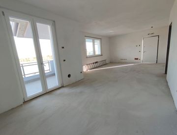 Grande zona living open-space con ampia vetrata e cucina abitabile con uscita sul balcone, disimpegno che conduce alla zona notte con tre camere da letto, doppi servizi e balcone nella zona notte.