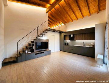 L'abitazione colpisce per la luminosa zona living d'impatto, dove i soffitti alti accolgono un suggestivo soppalco ideale come studio o area relax. La zona notte, collegata da un pratico disbrigo armadiabile, comprende una camera matrimoniale, una camera media attualmente integrata nel soggiorno e un bagno finestrato con doccia.