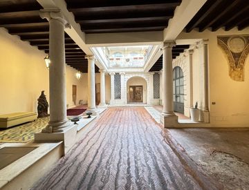 L'accesso avviene da un ingresso pedonale e carraio che conduce direttamente nella corte monumentale, impreziosita da colonne doriche, arcate in pietra e balconate storiche. Questo spazio, totalmente protetto e silenzioso, rappresenta il cuore scenografico dell'intera proprietà, raro da trovare nel centro storico.