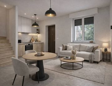 Al piano terra si sviluppa una luminosa zona living con cucina a vista, uno spazio moderno e funzionale, ideale per momenti di relax e convivialità.