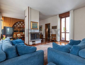 L’ingresso si apre su un luminoso soggiorno con doppia esposizione, impreziosito da un camino centrale che divide la zona living dalla zona pranzo. Un piccolo balconcino completa la zona giorno.