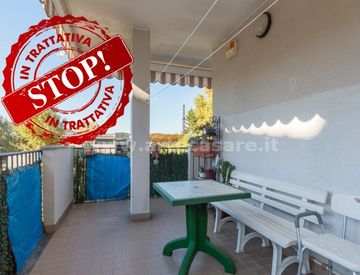 L’appartamento è composto da un luminoso soggiorno con cucina leggermente separata ma a vista, una porta finestra che si apre su un ampio terrazzo coperto. Il disimpegno ampio ospita un'armadio di buone dimensioni, il bagno è stato rifatto recentemente, equipaggiato con doccia e predisposizione per lavatrice. La spaziosa camera matrimoniale, anch’essa dotata di porta finestra, offre l'accesso al terrazzo.