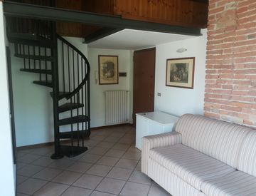 A Campagnola Cremasca, tranquillo paesino a 5 minuti da Crema, grazioso e ampio monolocale al primo piano con travi a vista, interamente arredato e composto da soggiorno con angolo cottura, zona letto soppalcata, bagno e balcone.