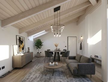 I rivestimenti sono in eleganti e moderne ceramiche di alta qualità, gli infissi in PVC con doppi vetri, garantiscono un ottimo isolamento termico e acustico, mentre le travi a vista aggiungono un tocco di eleganza all'ambiente.