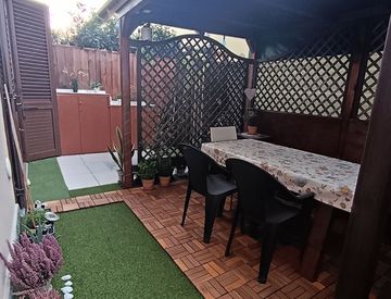 Piccolo giardino privato attrezzato per rilassarsi all'aperto.