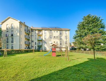 Situato in un contesto condominiale curato e tranquillo, l'immobile è circondato da ampie aree verdi, ideale per chi ama la natura. Inoltre, la zona è ben servita da negozi e servizi, assicurando tutto il necessario a portata di mano. Completano l'offerta un box auto e una cantina, rendendo questo appartamento una soluzione completa e funzionale.