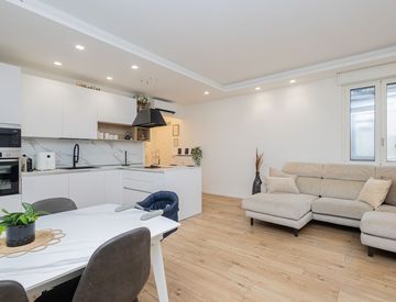 L’ingresso conduce all’ampio e moderno soggiorno con cucina a vista, impreziosito da una penisola di design, ideale per vivere la quotidianità con stile e funzionalità. Da qui si accede al balcone, perfetto per momenti di relax all’aperto.