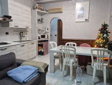 Sul lato destro, con affaccio interno silenzioso, si sviluppa un ampio soggiorno con cucina a vista, ben attrezzata su una parete.