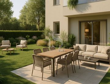 L'unità abitativa A occupa il piano terra della nuova palazzina San Pio X e si caratterizza per la chiarezza distributiva e la continuità tra spazi interni ed esterni.