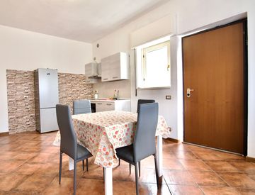L'appartamento ci accoglie dapprima nel luminoso soggiorno con angolo cottura funzionale e ben attrezzata, con lo spazio necessario ad ospitare elettrodomestici e tavolo da pranzo.