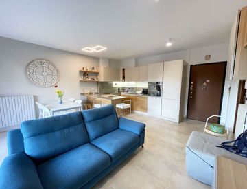 L'immobile è composto da un accogliente soggiorno che include la zona pranzo con cucina a vista completamente attrezzata. La luminosa e grande porta finestra apre lo sguardo sul terrazzo di 14mq, fornito di tende da sole, che rende l’appartamento ancora più confortevole e ottimo per godere di momenti di relax nei periodi più miti.