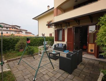 Dalla portafinestra della cucina si passa direttamente all'esterno dove troviamo il giardino di proprietà di mq. 60, con salottino in PVC, illuminazione su pavimentazione esterna, ideale per trascorrere rilassanti serate in compagnia di amici.