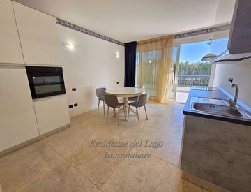 AL CONFINE TRA DESENZANO D/G E SIRMIONE Proponiamo in esclusivo residence con scenografica piscina ampio grande ed elegante appartamento bilocale al piano terra con terrazzo di oltre 30 mq accessibile dalla zona giorno e notte.
