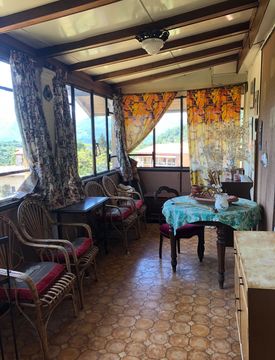 In porzione di casa bifamiliare ampio appartamento libero subito ultimo piano con veranda a vetri con vista panoramica, ingresso, ampio soggiorno con camino, terrazzo scoperto e veranda, cucina abitabile, 2 camere matrimoniali di cui una con balcone, bagno, solaio e ripostigli. Al piano terrra ampia cantina con accesso per moto e biciclette, dotata di acqua. Parzialmente da riattare. Annesso box e posti auto con giardinetto privato. Ottima posizione...