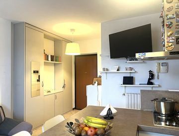 L’appartamento gode di una splendida esposizione a ovest, con bella vista aperta sui tetti della città, ed è così composto da ingresso, soggiorno con cucina a vista, con affaccio diretto su un grande terrazzo coperto, disimpegno, due camere da letto e bagno finestrato