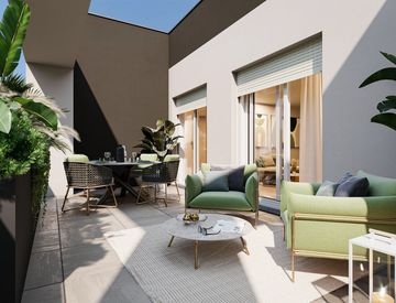 La zona giorno si sviluppa in un ampio soggiorno con cucina a vista, entrambi con accesso diretto al terrazzo, perfetto per momenti conviviali e relax all’aperto.