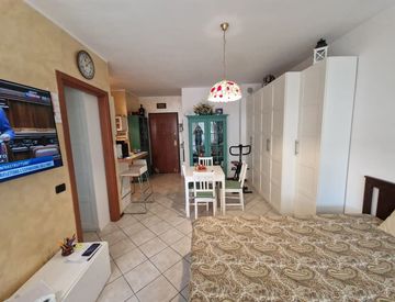 La soluzione è composta da ingresso nella zona giorno/notte, con presenza di parete con angolo cucina, tavolo oltre credenze e parete dedicata a letto matrimoniale con ampio armadio.