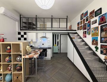 Monolocale con cucina a vista, divisorio per ospitare letto o divano-letto disimpegno e bagno. Tramite una comoda scala che funge da armadiatura si accede ad un utilissimo soppalco in quota dai molteplici utilizzi