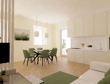 La nuova disposizione dell'appartamento prevede soggiorno con angolo cottura, due camere, bagno finestrato, terrazzino e balcone. Gli spazi saranno rivisitati con gusto e attenzione ai dettagli, per garantire comfort e funzionalità.