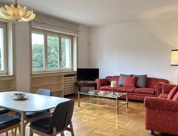 L’appartamento, ampio e luminoso, è composto da un ampio soggiorno con due grandi divani, tavolo da pranzo, grandi finestre e un balcone che si affaccia su un’area verde e una cucina abitabile completamente arredata con balcone.