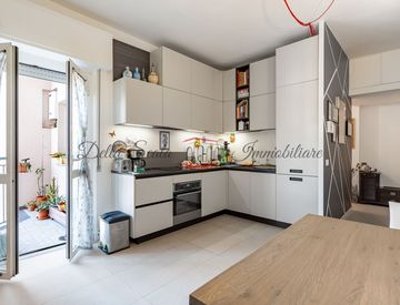 Luminoso e silenzioso appartamento caratterizzato da una doppia esposizione, con due balconi, composto da ingresso sul disimpegno, soggiorno con cucina e balcone sul cortile interno, camera con balcone sull'interno, cameretta con doppia finestra, bagno e lavanderia. ripostiglio aereo. Cantina di proprietà al piano interrato.
