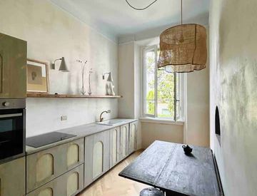 The flat consists of an entrance hall with a corridor, typical of Milanese period homes, an eat-in kitchen, two double bedrooms (one of the two bedrooms is equipped with comfortable sofa beds that allow the room to also be used as a living area) with small balconies, an office/showroom space and a bathroom.