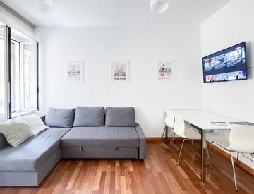 Questo moderno appartamento è situato al terzo piano con ascensore in un tipico edificio italiano. All'ingresso dell'appartamento si trova il soggiorno con divano letto sulla sinistra e la cucina bianca, completa di tutti gli elettrodomestici necessari e un tavolo di vetro.