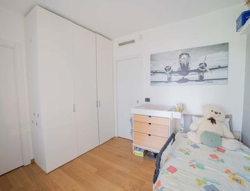 Questo appartamento molto luminoso è un trilocale elegante dalle finiture ricercate: la zona giorno si compone di un ampio salotto con luminose vetrate che permettono ingresso nel terrazzo dove è possibile sia fare una tranquilla colazione che riposarsi su una comoda sdraia. In terrazza troviamo anche un piccolo tavolo con sedie per area relax.