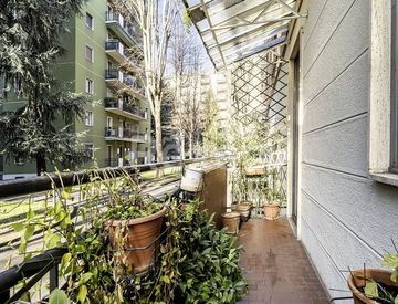 Pavimenti in ceramica, infissi esterni in alluminio con doppio vetro. L'immobile, sito al piano rialzato di un edificio di otto, gode di una doppia esposizione Est/Ovest. L'appartamento espone su di un ampio giardino condominiale. Parti comuni in buono stato di manutenzione. Spese condominiali Euro 2.700, 00/anno circa; riscaldamento centralizzato a radiatori.