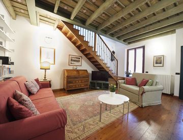 Soffitti con travi originali a vista, aria condizionata.