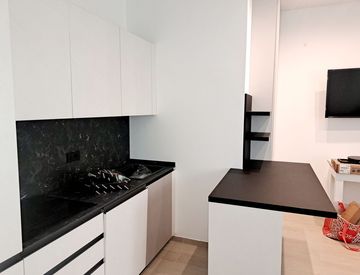 Il bilocale è composto da; ingresso, ampio soggiorno con splendida cucina a vista (con piastre ad induzione), camera da letto matrimoniale, ampia cabina armadio e bagno con box doccia.
