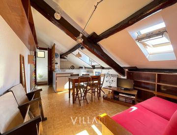 L’appartamento si presenta in ottime condizioni, con spazi ben distribuiti, soffitti inclinati, travi a vista e lucernari che regalano un’atmosfera calda e luminosa.