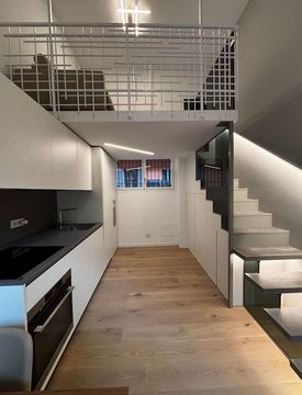 Una scala interna ti porta al soppalco, ideale come zona relax con TV e divano letto, perfetto per ospitare amici o goderti momenti di tranquillità. Il giardino privato è un'oasi di pace dove potrai rilassarti e godere del verde circostante. Completamente arredato con mobili di alta gamma, l'appartamento offre anche la possibilità di un box auto.
