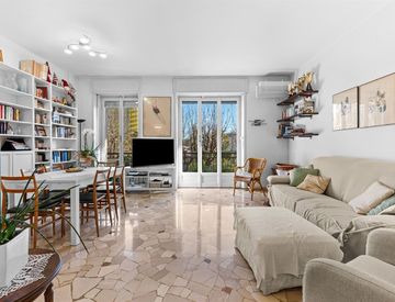 L'appartamento si trova al primo piano ed è composto da ingresso, soggiorno, cucina abitabile, due camere, doppi servizi e due balconi. Completa la proprietà una cantina di pertinenza.