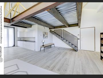 Lo stile è “Loft industrial” su due livelli, con alti soffitti e grande luminosità, grazie all'ampia vetrata che affaccia sul cortile interno e un balcone di proprietà.