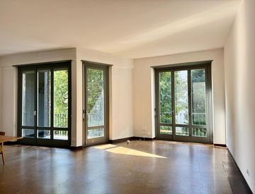 Ascensore con accesso diretto all'appartamento, l’ingresso non avviene immediatamente ma appena si arriva nell'ampio soggiorno colpisce la luce e le grandi vetrate sul giardino interno condominiale. Attraverso un gioco di porte, che fungono da quinte, si accede alla zona notte con 3 camere da letto essenziali e 2 bagni. Seguendo la pianta ottagonale si arriva ad uno studio/camera di servizio con un piccolo bagno lavanderia.