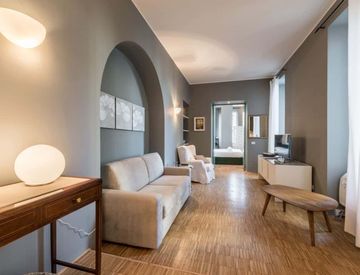 Il nostro open space offre un ambiente raffinato e accogliente, arredato con gusto e attenzione ai dettagli. La zona giorno è un vero e proprio angolo di relax, con un comodo divano letto e una poltrona perfetta per leggere un buon libro o guardare la Smart TV con connessione Wi-Fi gratuita. L'ampio spazio è illuminato da grandi finestre che offrono una splendida vista sulla città.