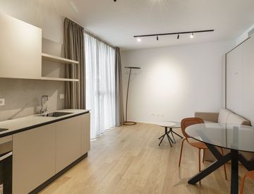L’appartamento viene consegnato arredato con cucina, zona pranzo divano e letto a scomparsa. Disimpegno allestito a cabina armadio e bagno.