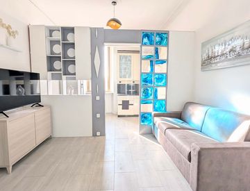 Zona Giorno: Area living luminosa con parete di design in vetrocemento, Smart TV di 49 pollici e divano-letto.
