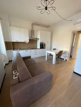 L'appartamento è composto di un ampio e luminoso soggiorno dotato di cucina a vista, due camere (al momento arredate con letto singolo ma è possibile mettere un matrimoniale in 1 delle due stanze), bagno con aspirazione forzata e con cabina doccia, lavasciuga.