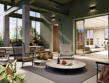 L'appartamento B4.1 è una soluzione sita al quarto e ultimo piano di ca. 158 mq ed è composta da una spaziosa zona living con cucina a vista e accesso al terrazzo, disimpegno, tre camere da letto e tre bagni, di cui due finestrati.