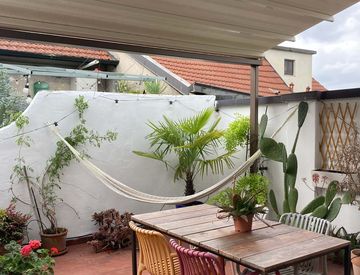 Il vero punto forte è la terrazza privata di 25 m², silenziosa e affacciata sul cortile interno, ideale per lavorare all’aperto, rilassarsi o cenare con gli amici. È dotata di tenda da sole motorizzata con telecomando.
