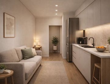 L’appartamento, molto luminoso e con una superficie di 51 mq, si apre su un ingresso che conduce al soggiorno con cucina a vista. Da questo ambiente si accede a un balcone di circa 2 mq (non incluso nella metratura indicata).