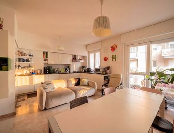 L’ingresso si apre su un corridoio distributivo che conduce armoniosamente alle diverse zone della casa. Il cuore dell’abitazione è rappresentato da un ampio living, affacciato su un gradevole balcone, perfetto per momenti di relax all’aperto. Lo spazio è organizzato con una confortevole zona divani/TV, area pranzo e una cucina angolare a vista completamente attrezzata, studiata per integrarsi con eleganza nel contesto della zona giorno.