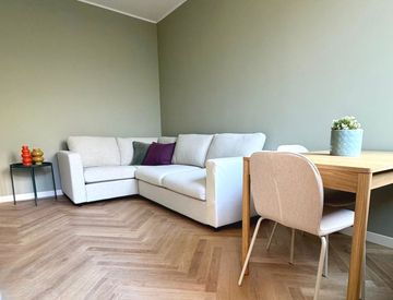 La cucina open space, dal design pulito e attuale, è completamente attrezzata con elettrodomestici modern Le tonalità morbide e i dettagli curati si integrano perfettamente con lo stile dell’appartamento. bagno elegante completamente nuovo con rivestimenti ricercati e ampia doccia