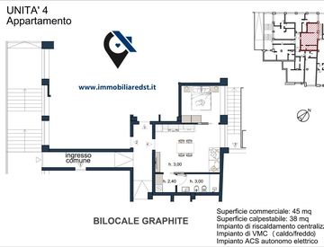Dotato di impianto di riscaldamento centralizzato, fornitura di acqua calda sanitaria centralizzata, aria condizionata, ventilazione meccanica, serramenti in PVC con doppio vetro e porta blindata.