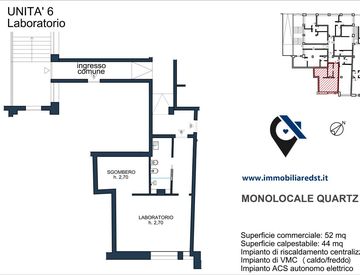 Dotato di impianto di riscaldamento centralizzato, fornitura di acqua calda sanitaria centralizzata, aria condizionata, ventilazione meccanica, serramenti in PVC con doppio vetro e porta blindata.