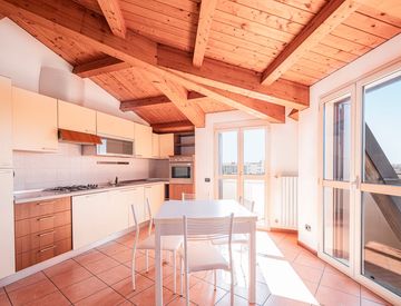 L’appartamento viene consegnato con l'arredato della cucina, rifinita e accessoriata (lavastoviglie, fornelli a gas e forno), area living con tavolino e sedie, e bagno con mobile lavabo.