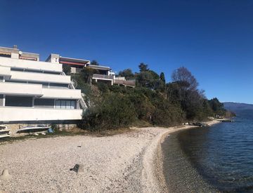 In residence fronte lago panoramico appartamento, ideale come seconda casa, arredato e composto da soggiorno con camino, angolo cottura, 1 camera matrimoniale, 1 camere doppia, 1 singola, 1 bagno, ripostiglio, terrazza con splendida vista lago, 1 posto auto scoperto. Accesso diretto al lago. Contratto 4+4, no contratto stagionale. Riscaldamento e raffrescamento esclusivamente con pompa di calore. Sono richieste referenze lavorative.
